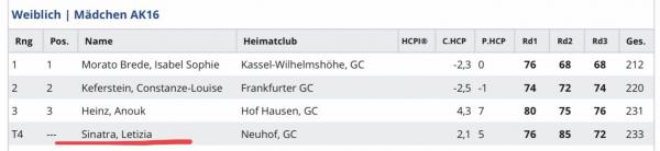 Als Beste in Hessen stehen im Jahrbuch 2024 des Hessischen Golfverbands ab sofort die Neuhöfer Matteo Landmann (AK 12), Sophia Leininger (AK 12), Leila Bechtold (AK 14), Moritz Küls (AK 16) und Valentina Zickler (AK 18). Damit kommt von der AK 12 bis zur AK18 jeweils ein Hessen-Champion vom Golf-Club Neuhof!